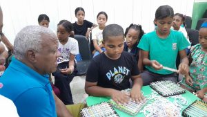 Una vez concluida la proyección de El Grito de Capotillo, los estudiantes asistentes, bajo la orientación de Sergio Diaz, miembro de la Organización Dominicana de Ciegos, Inc., pasaron a participar en el proceso de elaboración de pañitos de cocina para sostener calderos calientes, utilizando telares y algunos troqueles y recortes de tela empleadas en la fabricación de calcetines.
