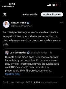 Finalmente, lo ocurrido ayer en la esfera pública digital demuestra cómo las redes sociales se han convertido en un espacio central de comunicación política en el país. Las declaraciones de Raquel Peña y Luis Abinader ponen en evidencia un discurso alineado en torno a la transparencia y la rendición de cuentas, valores que los dominicanos reclaman con insistencia. El reto ahora será transformar estas palabras y gestos en resultados tangibles que refuercen la confianza en la institucionalidad y consoliden el compromiso de luchar contra la corrupción en todos los niveles del Estado.